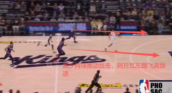 威少突破分球给强侧幽灵区的雷诺,雷诺空位接球后立即出手抛投,与此同时阿丘瓦已经从弧顶长驱直入杀向篮下伺机拼抢前场篮板。